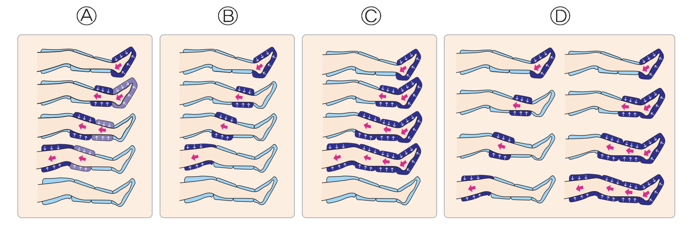 Programm C: Die Druckluft in der Manschette bewegt sich sequenziell von Fuß zu Oberschenkel. Die Druckluft tritt jedoch nicht in jeder Luftkammer aus, bis die 4. Luftkammer erreicht ist.